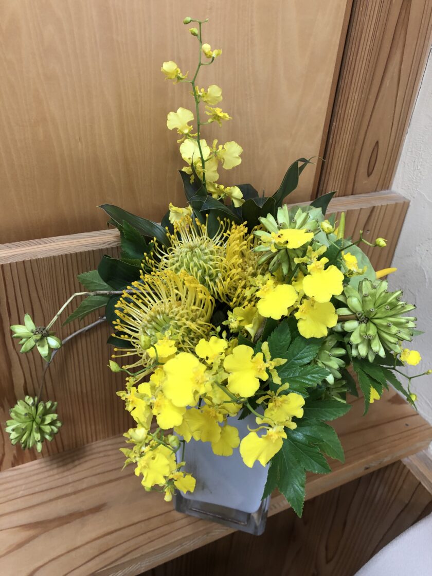 今週の花🌼 投稿日:2021.09.28 今週の花はこちらになります✨✨ カラッとした今の時期にピッタリな色合いで、黄色が映える作品となっています🐝 小さいバナナのようなカンレンボクもありますし、是非ともご鑑賞ください😊🎵